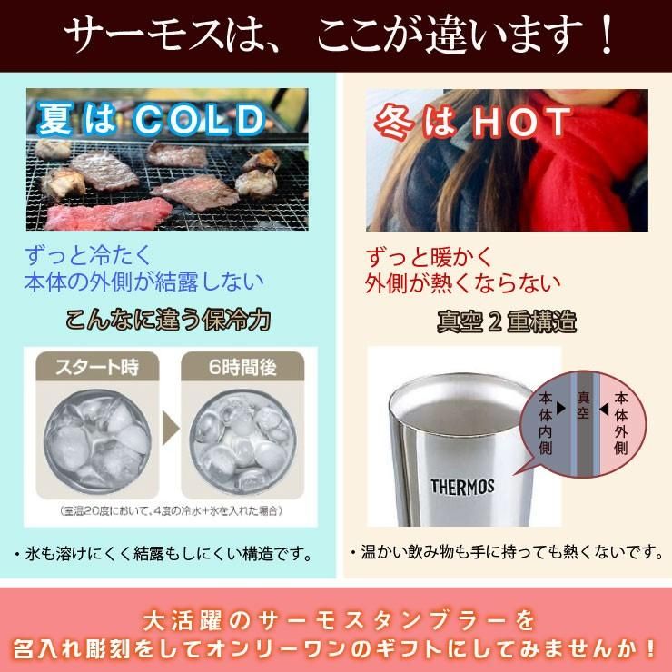 保冷保温に優れた魔法瓶構造を採用しています。真空二重構造により、飲み物の温度を長時間キープし、 いつでも理想の温度で楽しめます。また、名入れタンブラーとしてもおすすめできるアイテムです。 ビールだけでなく、様々な飲みものをタンブラーで楽しめます!