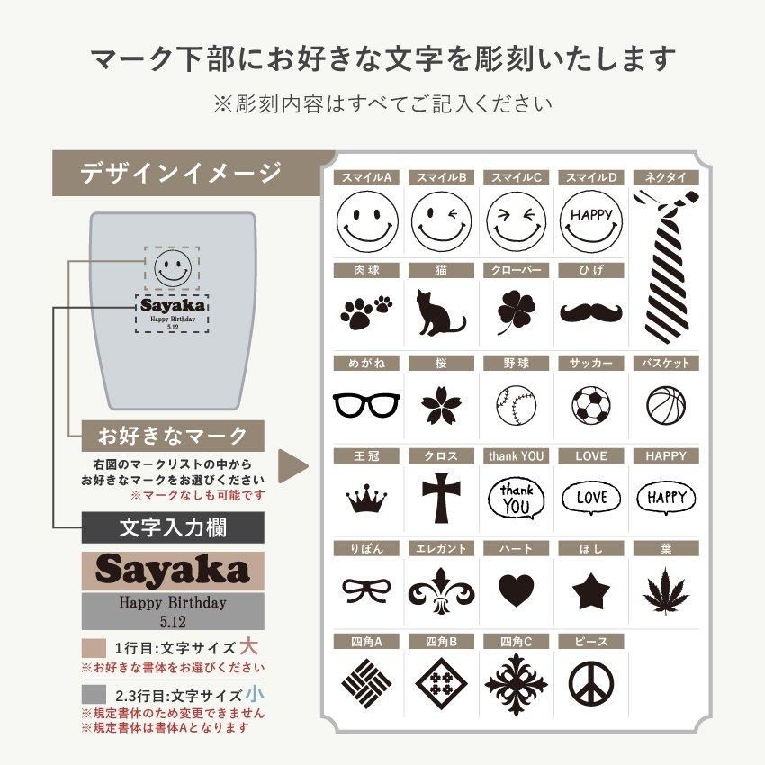 20種類以上の可愛いマークデザインレイアウトをご用意。黒字部分にお好きな文字を彫刻いたします。