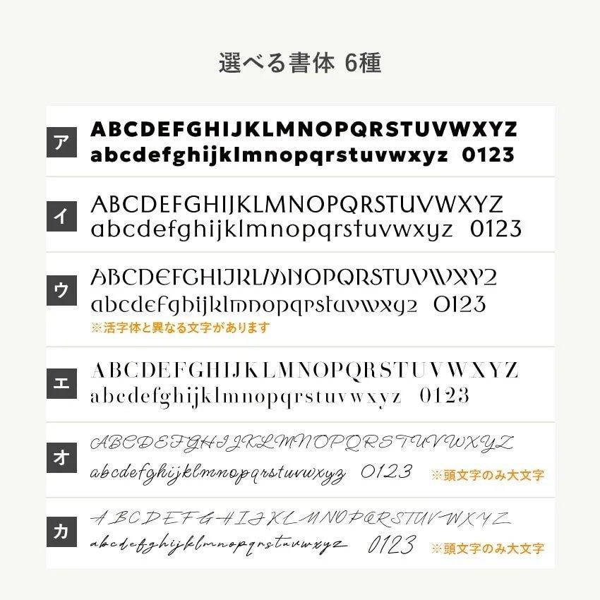 下記6種類の書体からお好きな書体をご選択ください。 筆記体フォントを選択した場合、頭文字のみ大文字となります。(書体 オ・カ) 書体 ウについては活字体と異なる文字がありますので、ご了承ください。