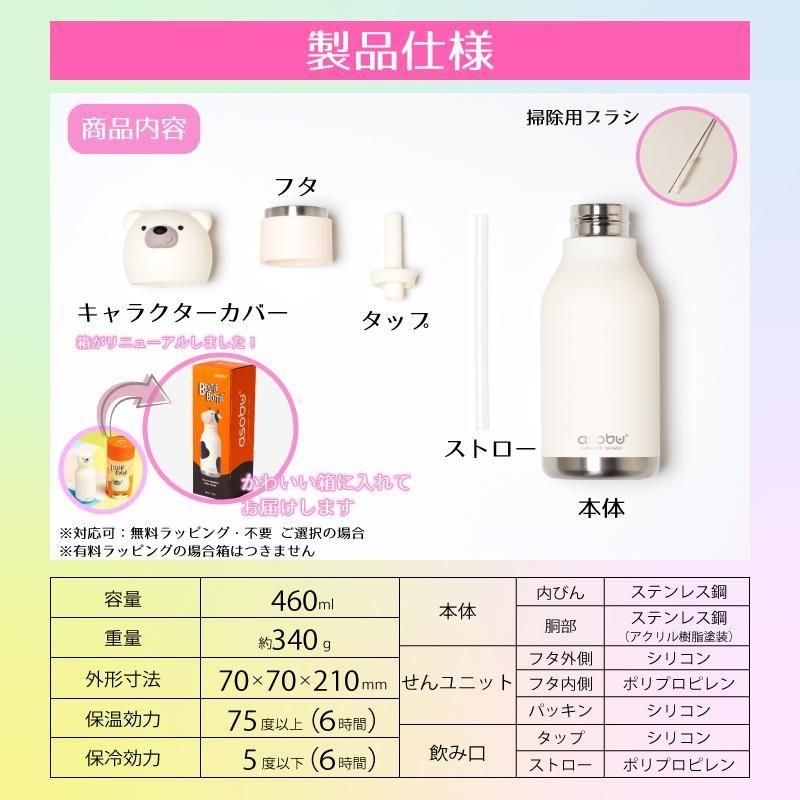 ◇◇BESTIE ベスティ 水筒 460ml◇◇ カナダ発 キャラクターカバーの取り外しができるかわいいステンレス製ボトル ストロー付き 付属のブラシでお掃除もしやすい おしゃれな水筒です。 ●容量:460ml ●サイズ:92x92x200mm (キャップカバー除く) ●重量:約265g(ストロー込み、キャップカバー除く) ●材質 ・ボトル本体 ステンレス鋼 ・キャラクターヘッド シリコンゴム ・内蓋 ポリプロピレン ・タップ:シリコンゴム ・ストロー:ポリプロピレン ・パッキン:シリコンゴム 耐熱温度:110℃ 耐冷温度:-20℃ ●付属品:ストロー、ストローカップ、ストロー用ブラシ ●食洗機:× ●漂白剤:× ●レンジ:× ●対象年齢:5歳以上 ※お手入れは柔らかいスポンジや手で優しく洗ってください。 ※塩素や漂白剤は使用しないでください。 ※アルコール・炭酸飲料不可