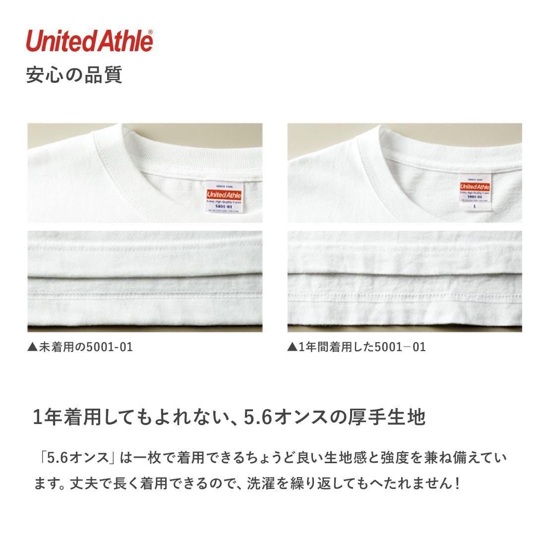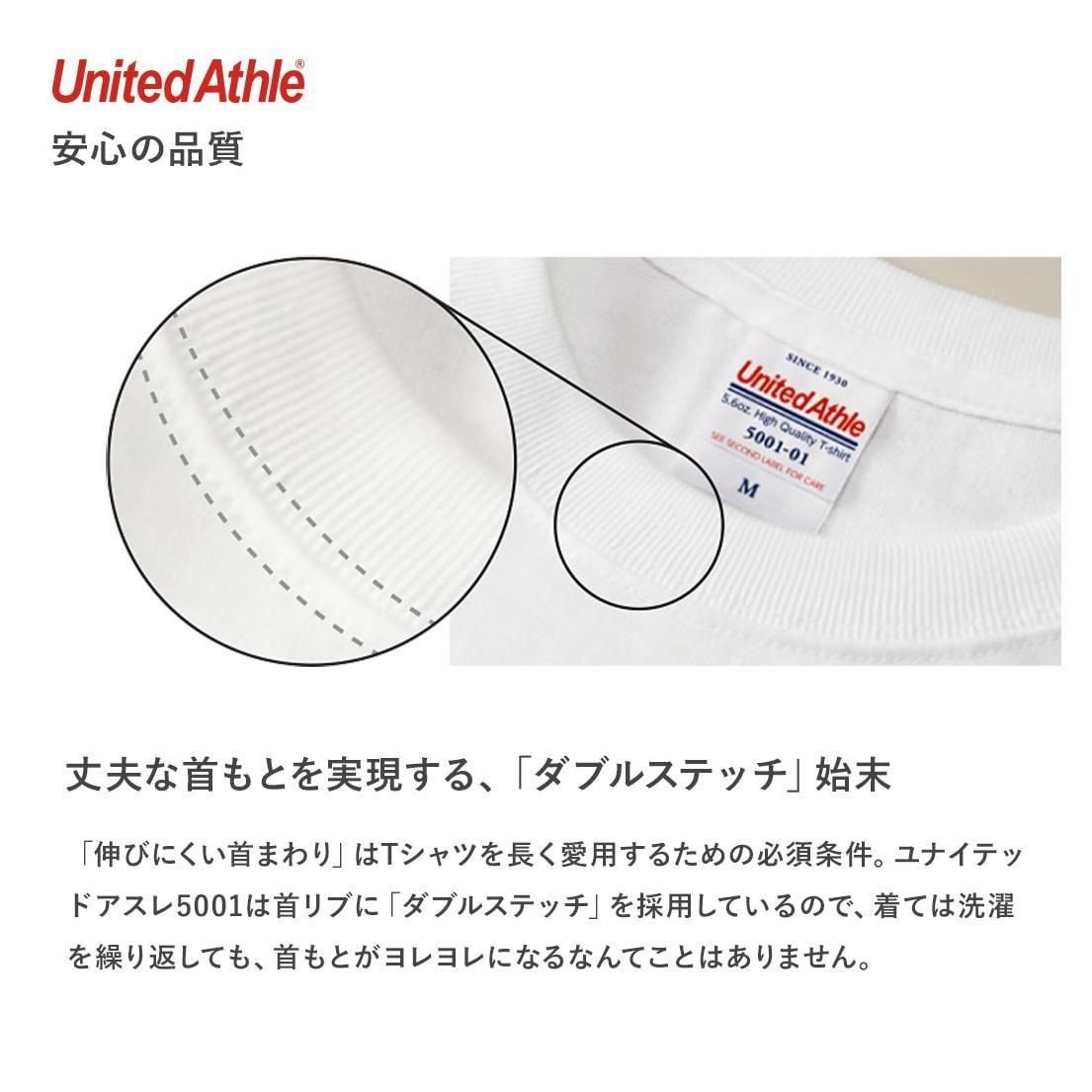 United Athleの特徴 丈夫な首もとを実現する、「ダブルステッチ」始末。 「伸びにくい首まわり」はTシャツを長く愛用するための必須条件。ユナイテッドアスレ5001は首リブに「ダブルステッチ」を採用しているので、着ては洗濯を繰り返しても、首もとがヨレヨレになるなんてことはありません。 1年着用してもよれない、厚手生地 1枚で着ても様になる万能型Tシャツ。Tシャツ選びの重要なポイントとなる「よれない」「透けない」「長持ちする」という3大要素をすべて兼ね備えています。
